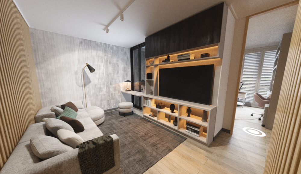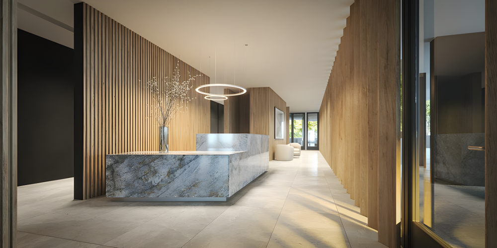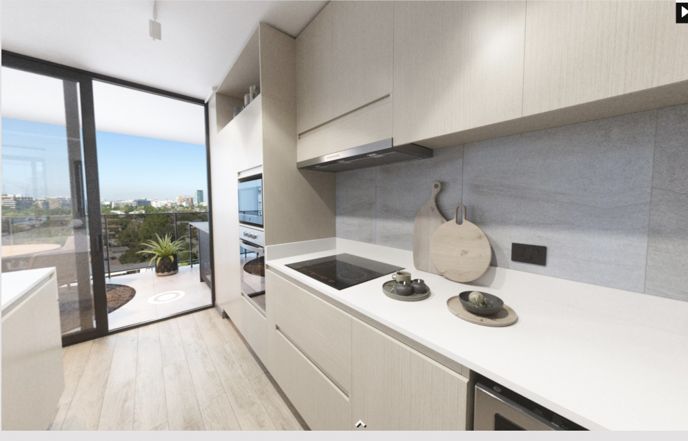 - Современные апартаменты с инновационной планировкой (например, 2 спальни и 3 ванные). В отделке использованы: водоотталкивающий пол SPC, окна ПВХ с термопанелями, металлические перила. Кухня оборудована техникой (духовка, стеклокерамическая плита, вытяжка) и столешницей из белого кварца. Также предусмотрены встроенные гардеробные и электрический подогрев пола.