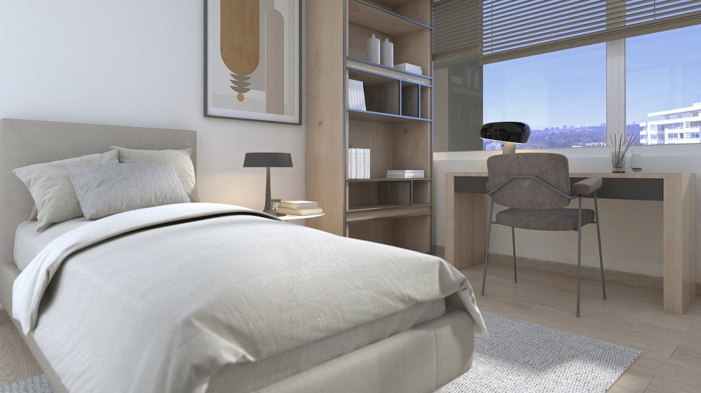- Резидентам доступны: тренажерный зал, открытый бассейн на крыше, терраса для барбекю, лаунж-зона.