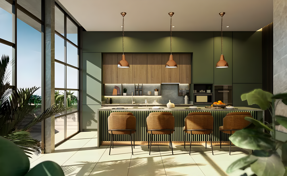 - Во всех апартаментах чистовая отделка и встроенная техника. Кухонные шкафы представлены с кварцевыми столешницами. Окна выполнены из натурального анодированного алюминия. В жилых зонах используется виниловый SPC-пол, керамогранит — в кухне, санузлах и на террасах.