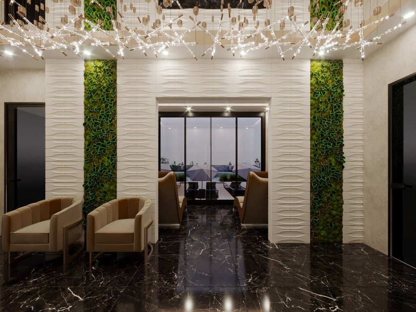 На первом этаже комплекса находятся уютные социальные зоны для отдыха и общения.