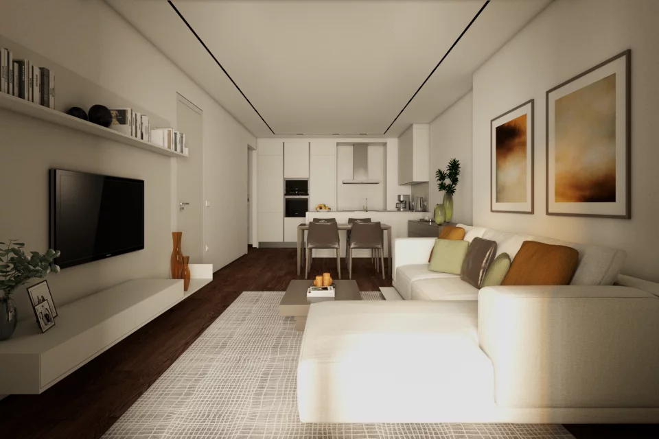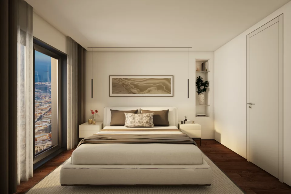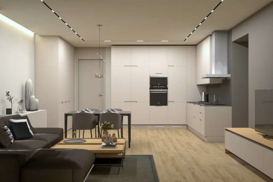 — Современные апартаменты с премиальной отделкой. Интерьеры выполнены в стиле модерн с использованием песочных, карамельных и агатово-серых оттенков со сдержанными черными акцентами.