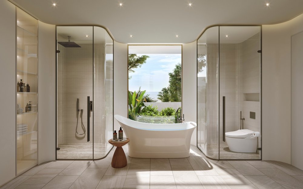 Каждая вилла построена на трёх уровнях. На верхнем расположены крытая парковка и мастер-спальня с собственной ванной комнатой, душем, ванной и просторным балконом с панорамным видом на море. Средний уровень представляет собой основную жилую зону с просторной гостиной и столовой открытой планировки, кухней в западном стиле и выходом на большую террасу с частным бассейном и зоной отдыха. Нижний уровень включает три дополнительные спальни, каждая с собственной ванной комнатой и выходом на балкон или террасу, где можно наслаждаться морским бризом и природными видами.
