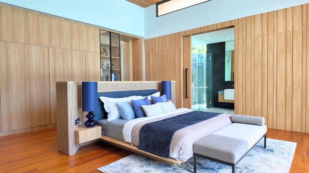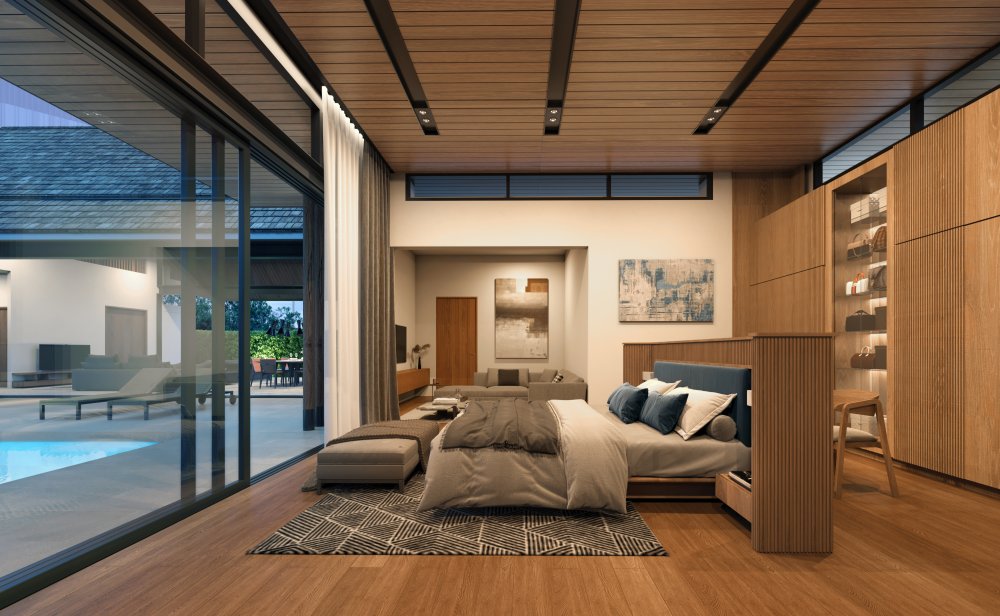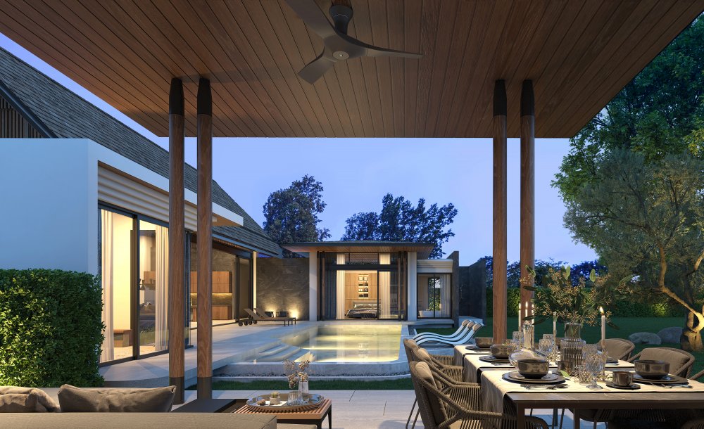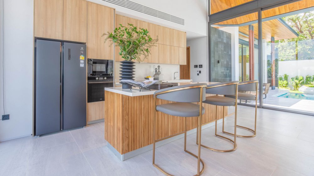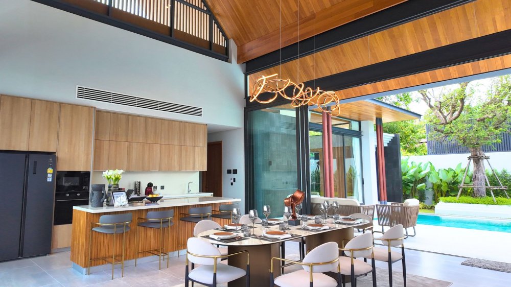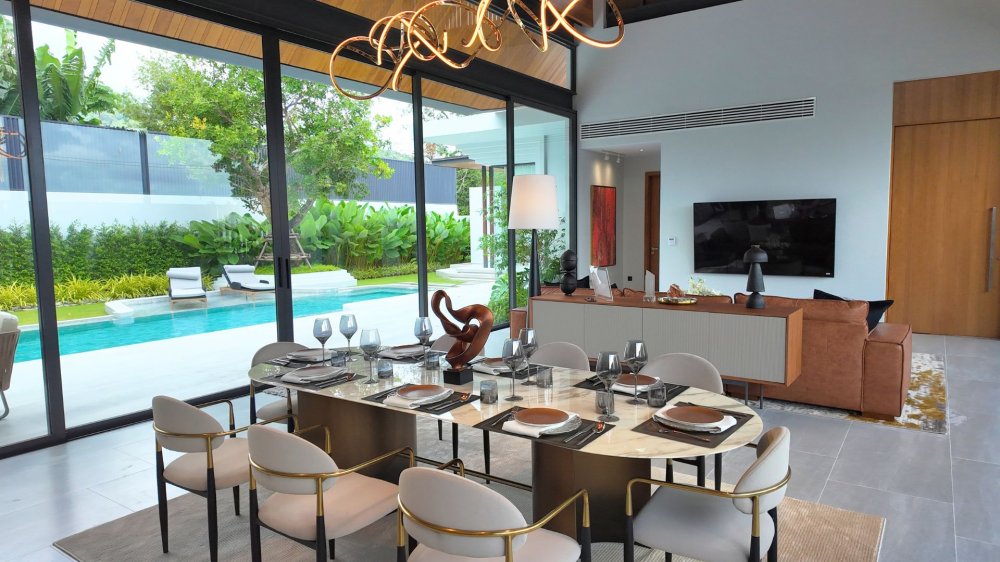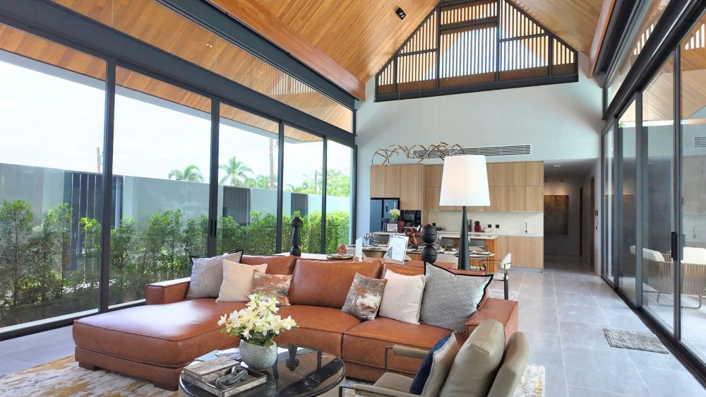 Эти виллы удивляют своим дизайном: сочетание двускатной крыши в традиционном тайском стиле с современными элементами создаёт уникальную архитектуру. Каждая планировка продумана так, чтобы обеспечить приватность и комфорт для всей семьи, при этом сохраняя пространство для общения и совместного отдыха. Тёплая и уютная гостиная станет местом, где создаются воспоминания, которые останутся с вами на всю жизнь.