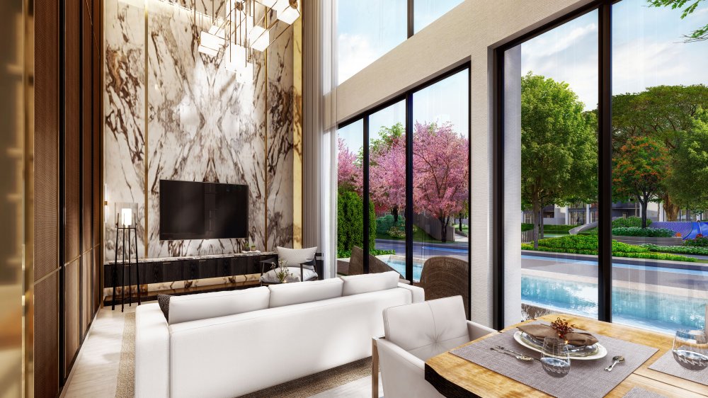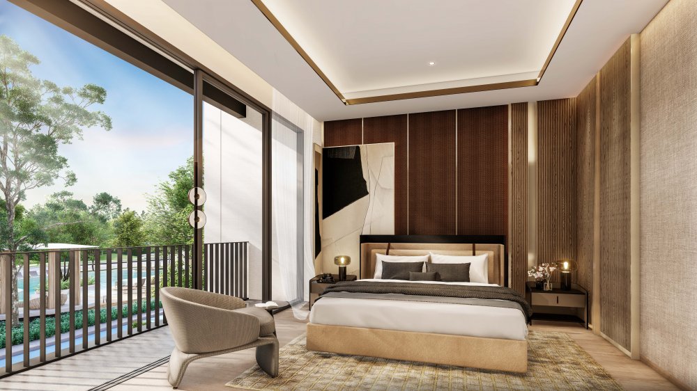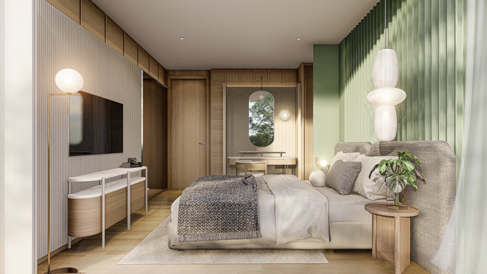 — Интерьеры выполнены в современном стиле с использованием природных текстур и натурального дерева. Амарантовые, лесные и янтарные оттенки гармонично сочетаются с премиальными элементами декора и текстиля. Высокие потолки и просторные планировки создают ощущение лёгкости, позволяя естественному свету проникать в каждую комнату.