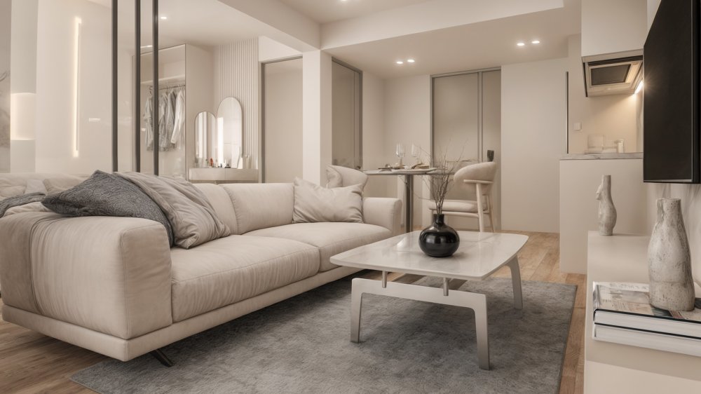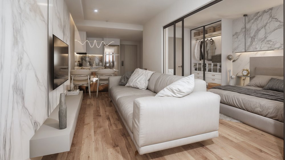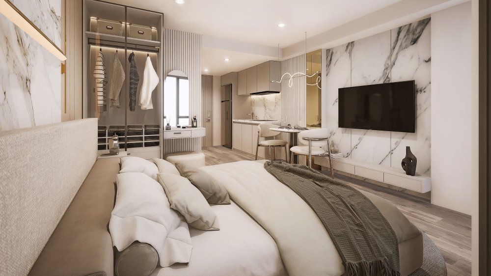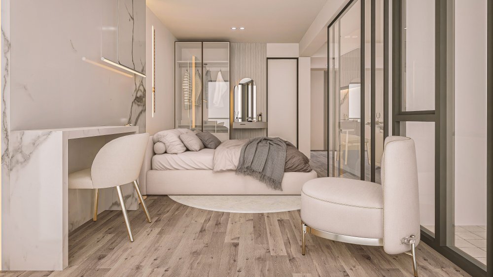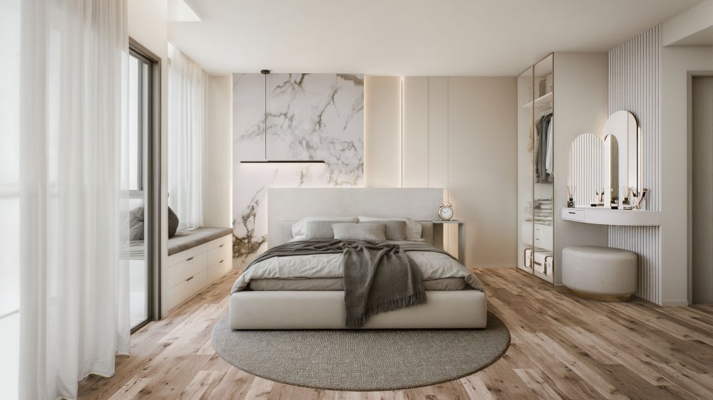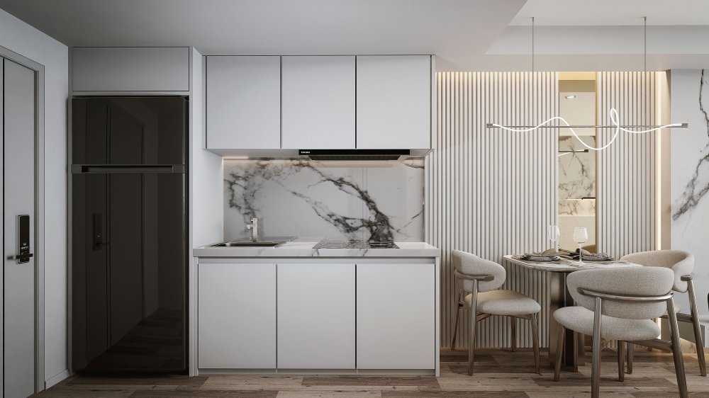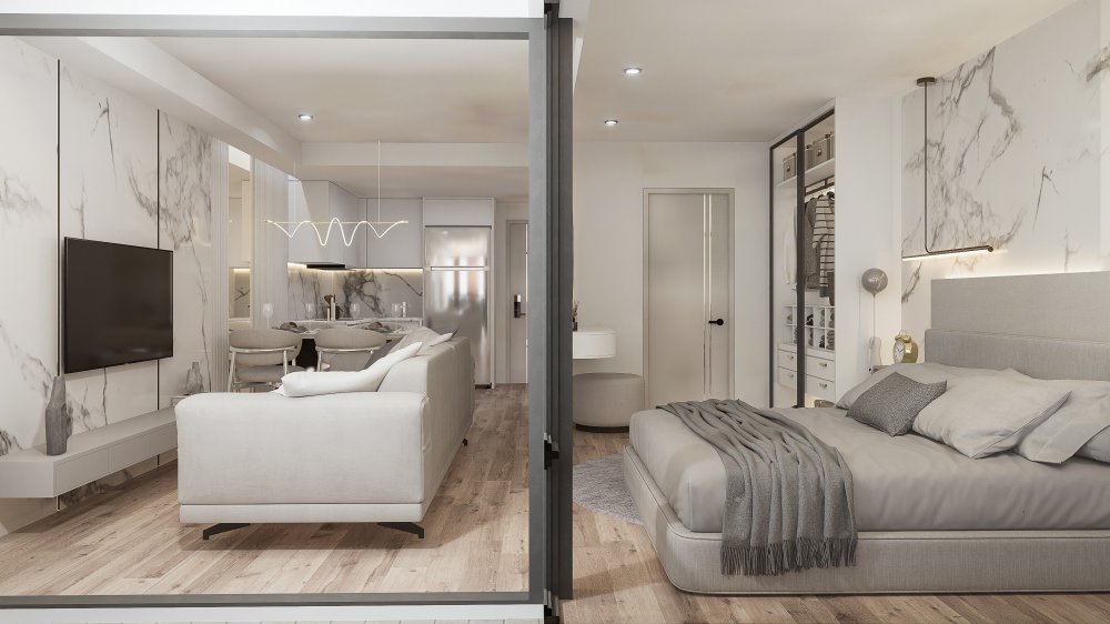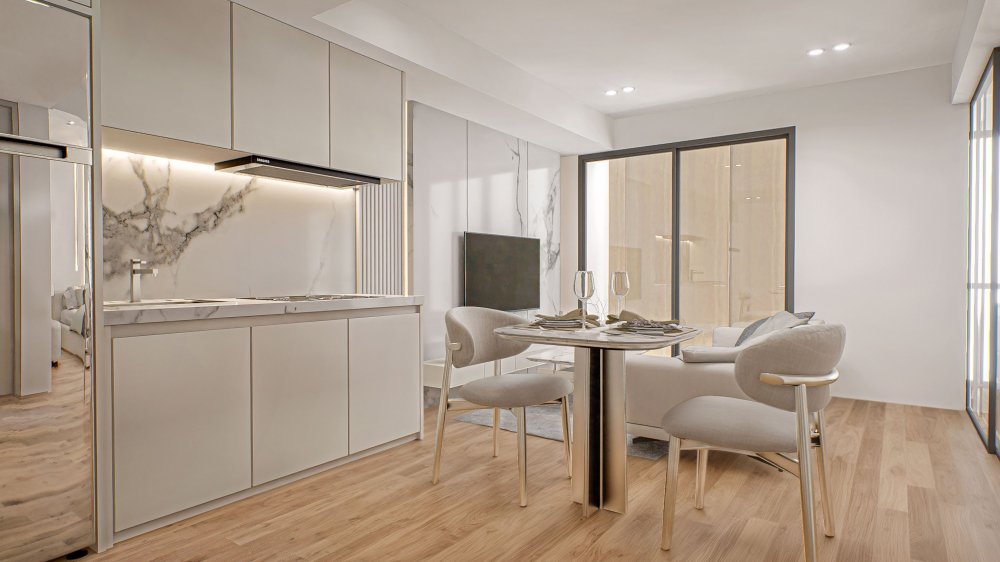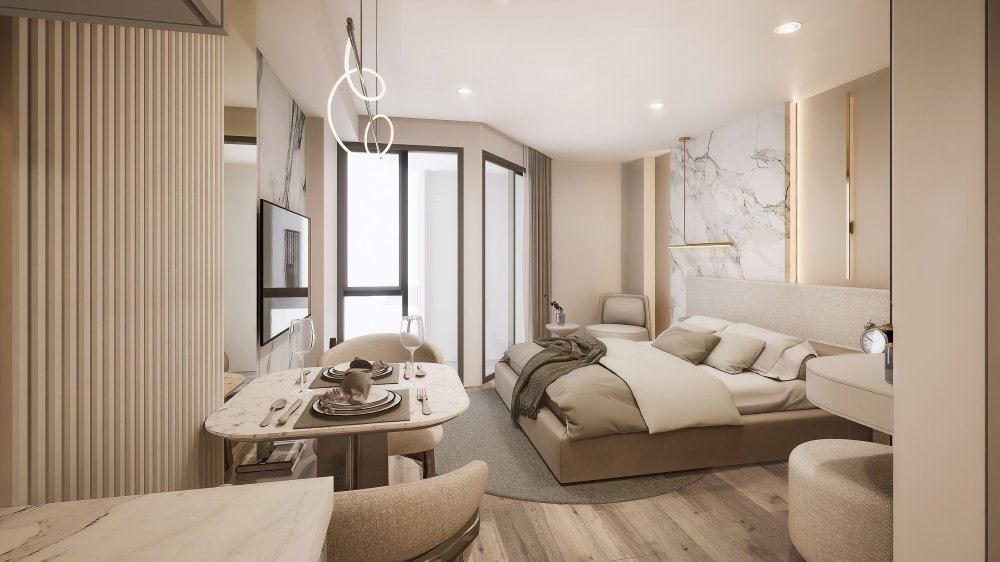 — Дизайн выполнен в стиле модерн с акцентом на светлые оттенки, белый мрамор и глянцевые поверхности. Открытые пространства, высокие потолки и панорамные окна в сочетании с естественным светом дарят интерьерам ощущение лёгкости и воздушности. Все апартаменты полностью меблированы и укомплектованы техникой.