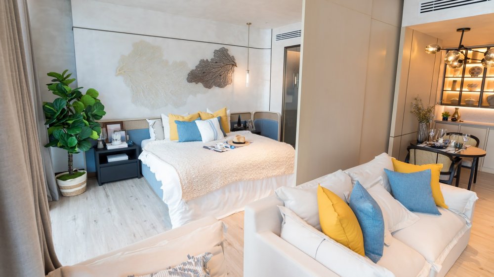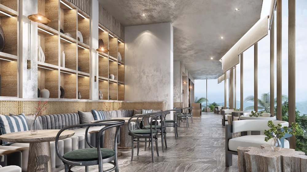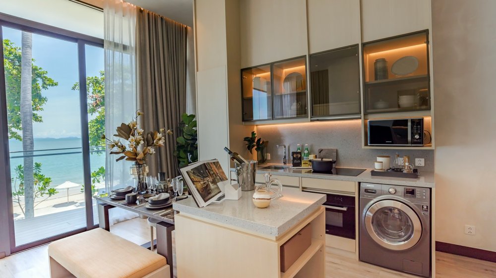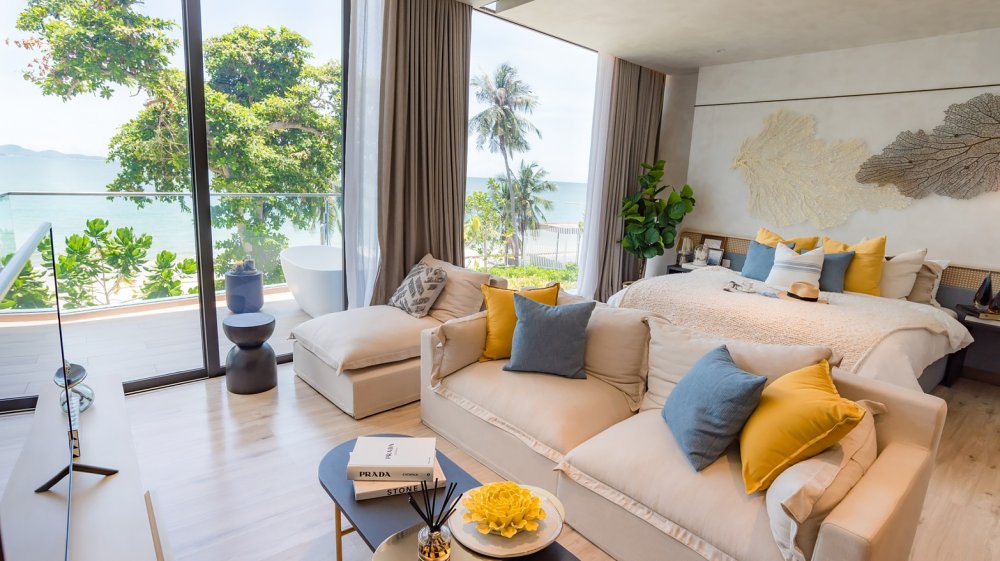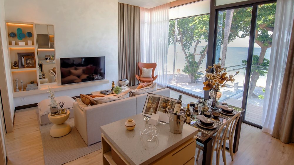 — Интерьеры выполнены в светлых цветах с использованием натурального дерева и камня. Бисквитный, медовый и оливковый оттенки подчеркивают открытые планировки и природные декорации. Из панорамных окон открываются поразительные виды на Сиамский залив, позволяя наслаждаться закатными вечерами. Все лоты оборудованы приватными террасами.