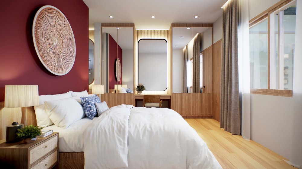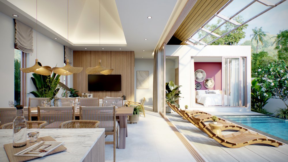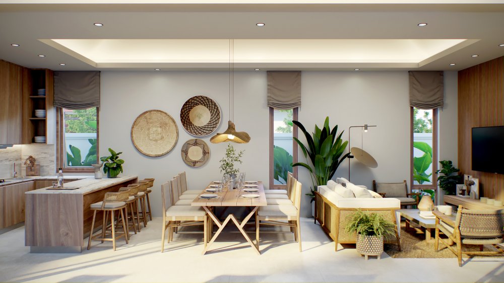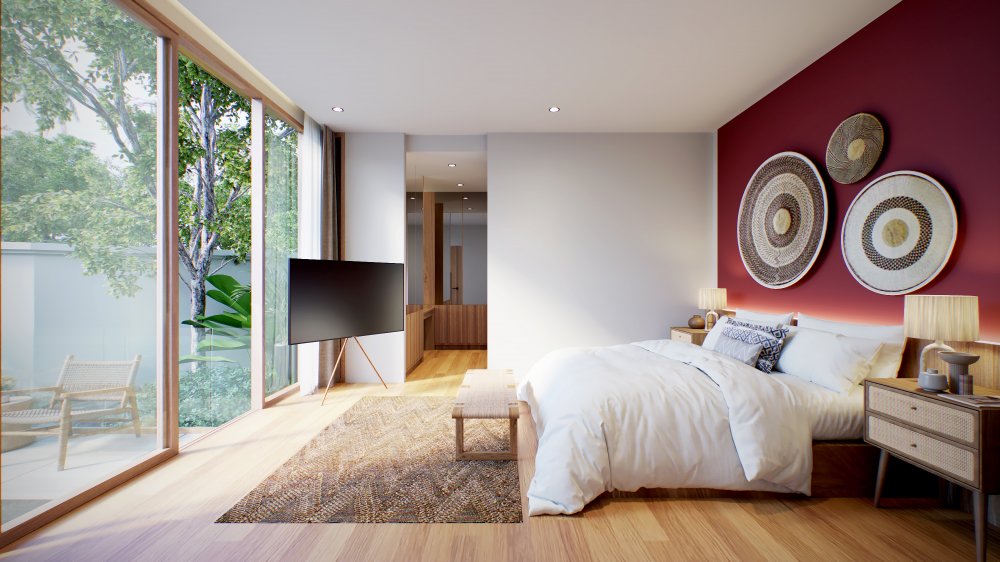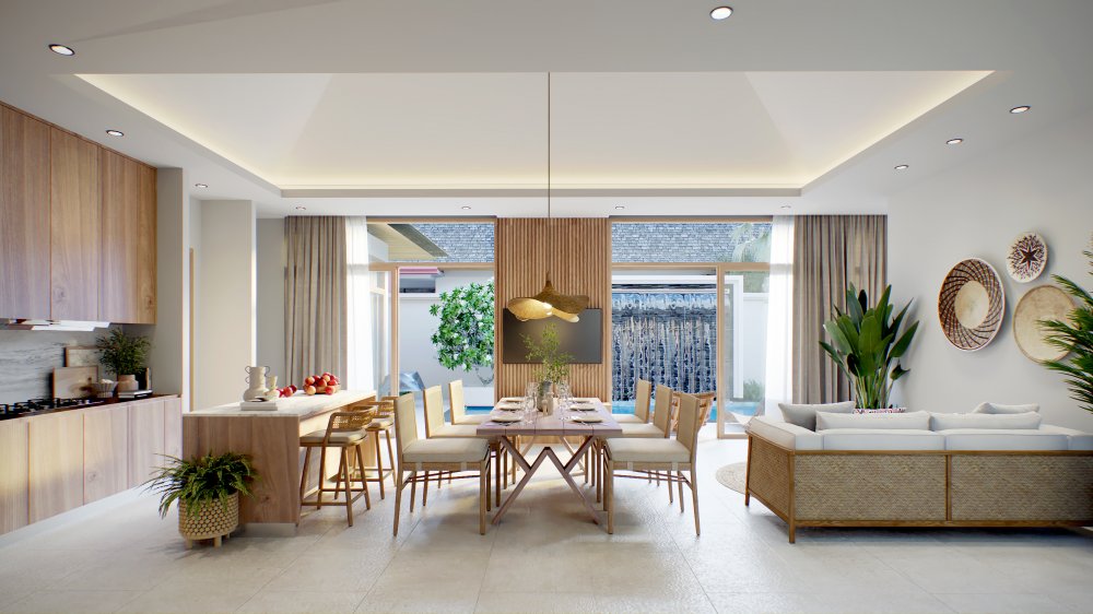 — Дизайн в стиле балийского модерна с открытыми пространствами, панорамными окнами и слайдинговыми дверями создают невидимые переходы между внутренними и внешними зонами. Большое количество естественного света выгодно подчеркивается светлыми оттенками в интерьерами и яркими акцентами цвета бургунди. Декорации выполнены из натуральных элементов и дополнены живыми растениями.