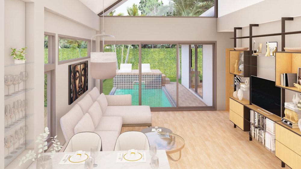 Гостям предлагаются различные типы вилл: от уютных двухуровневых апартаментов с одной спальней до просторных резиденций с четырьмя спальнями и панорамным видом на горы. Все виллы оборудованы собственными бассейнами, кухнями, зонами отдыха и террасами, идеально подходящими как для романтических вечеров, так и для семейного отдыха или проведения праздников. Интерьеры оформлены в современном азиатском стиле с использованием натуральных материалов, мягких текстур и тёплой цветовой палитры, что придаёт пространству ощущение уюта и утончённой роскоши.