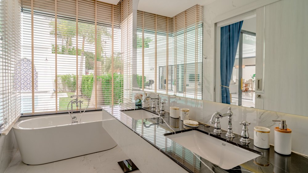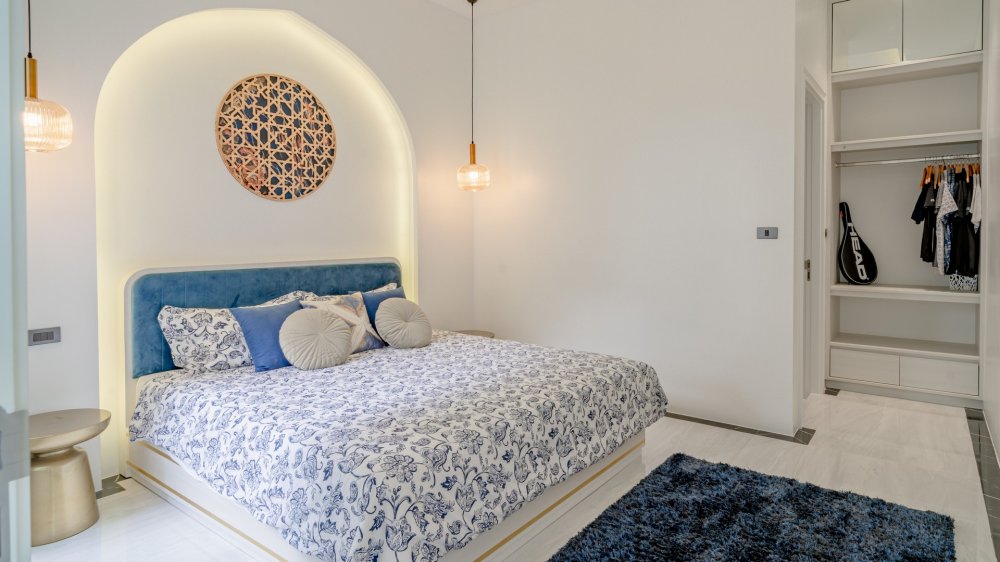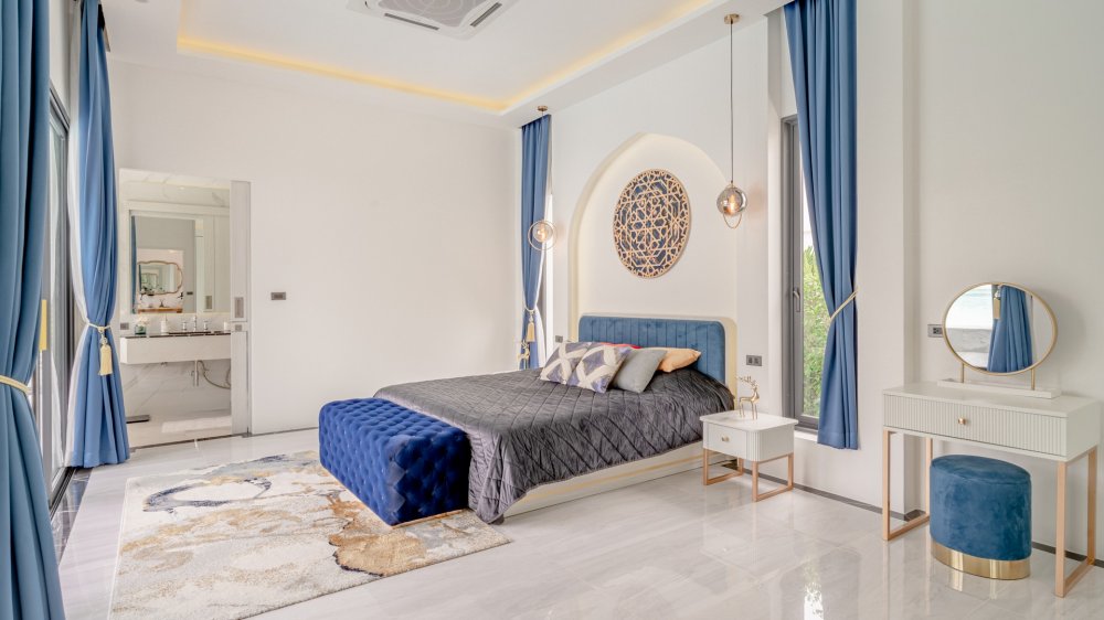 Вилла располагает тремя просторными спальнями, каждая из которых оформлена с изысканным вкусом и включает элементы ближневосточной эстетики, дополненные современными акцентами. Большие окна наполняют помещения естественным светом, а стеклянная дверь ведёт на уютный балкон, в сад и к бассейну.