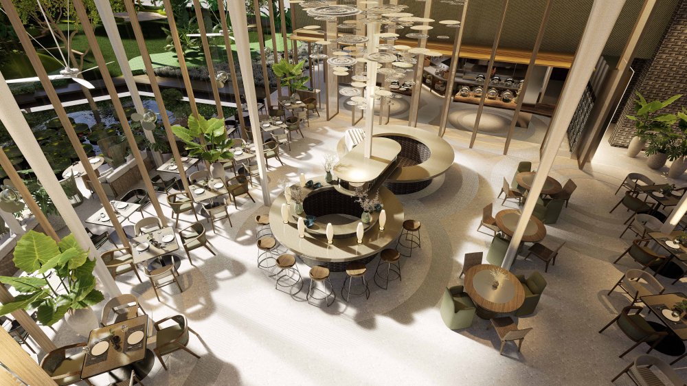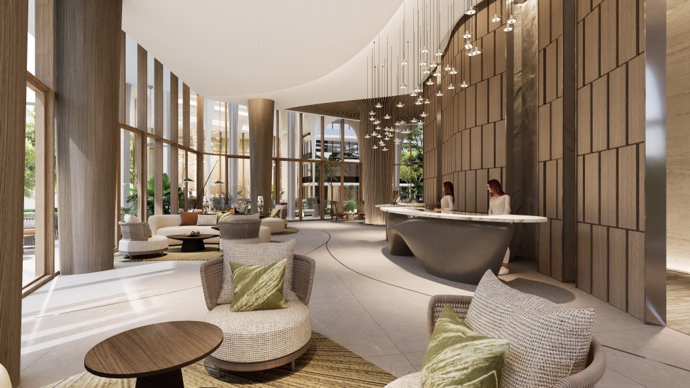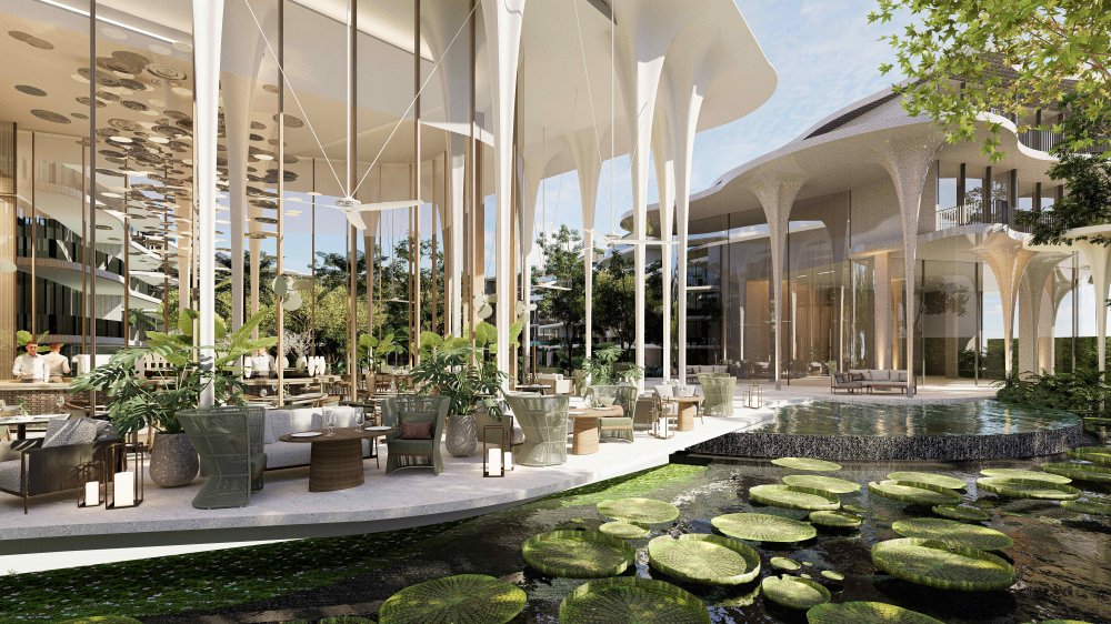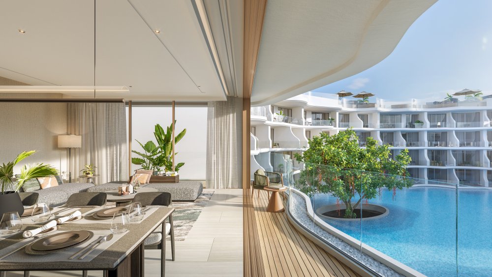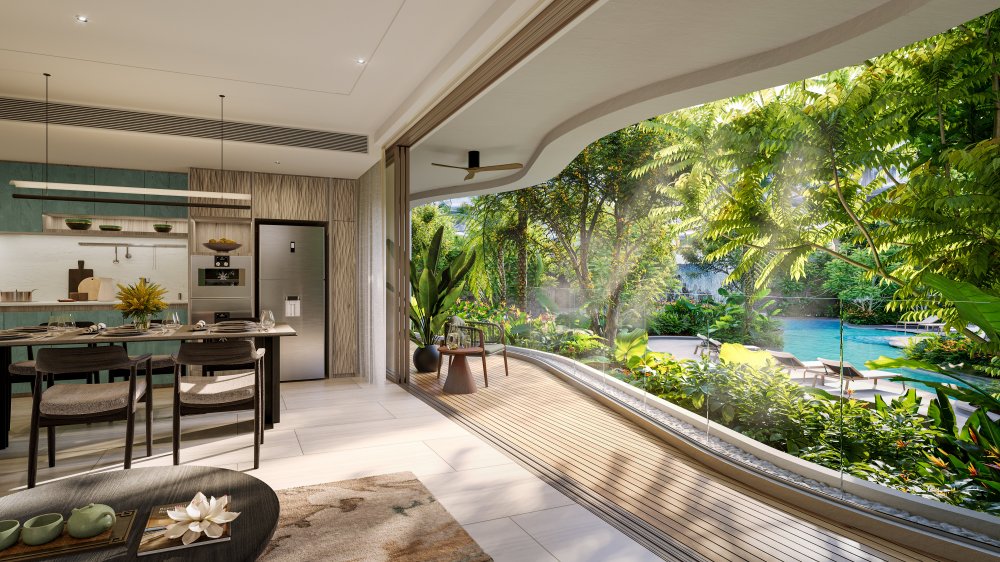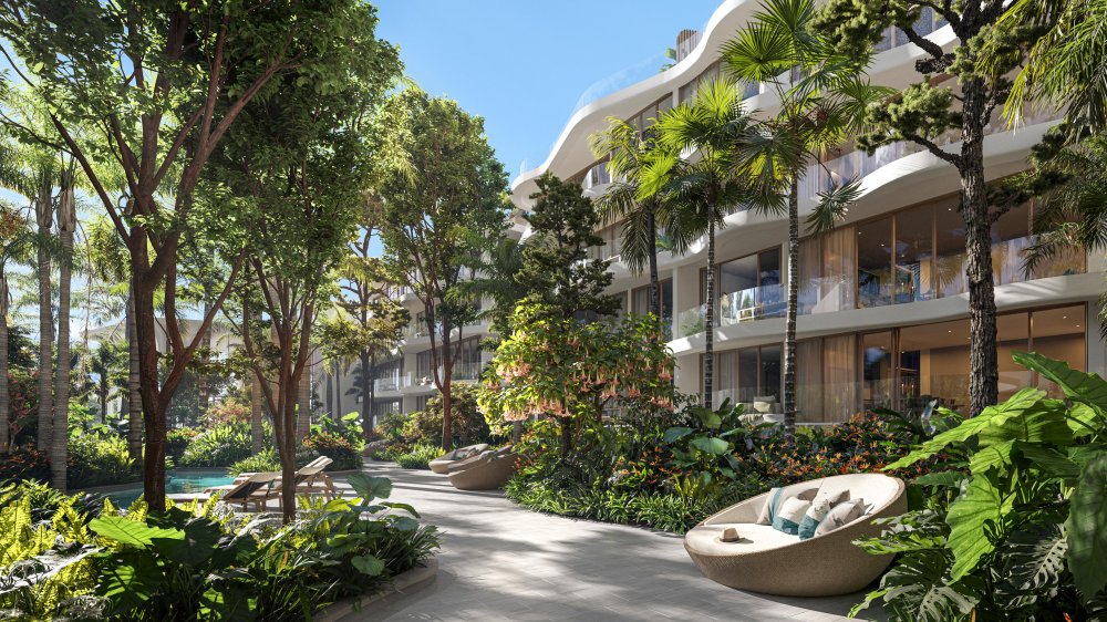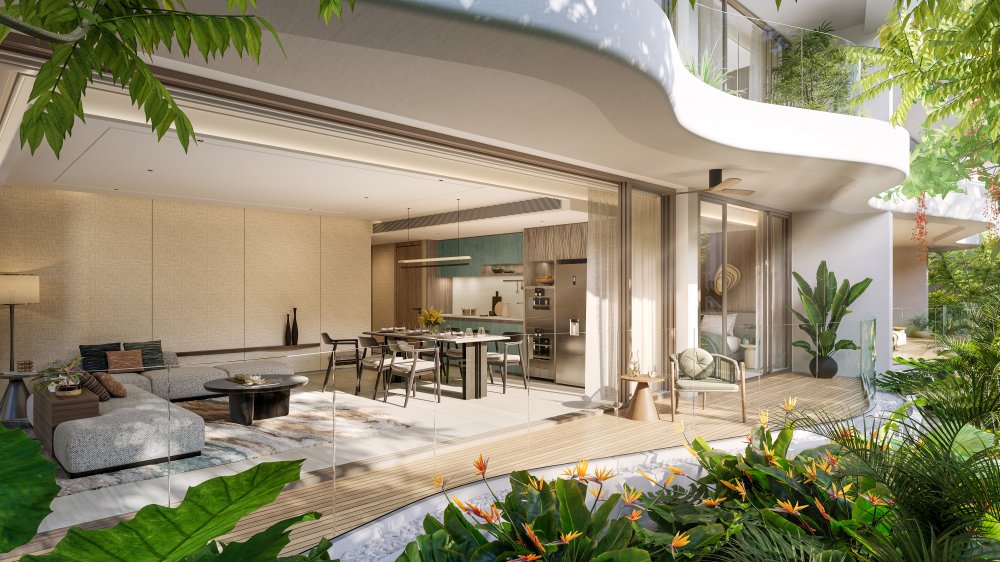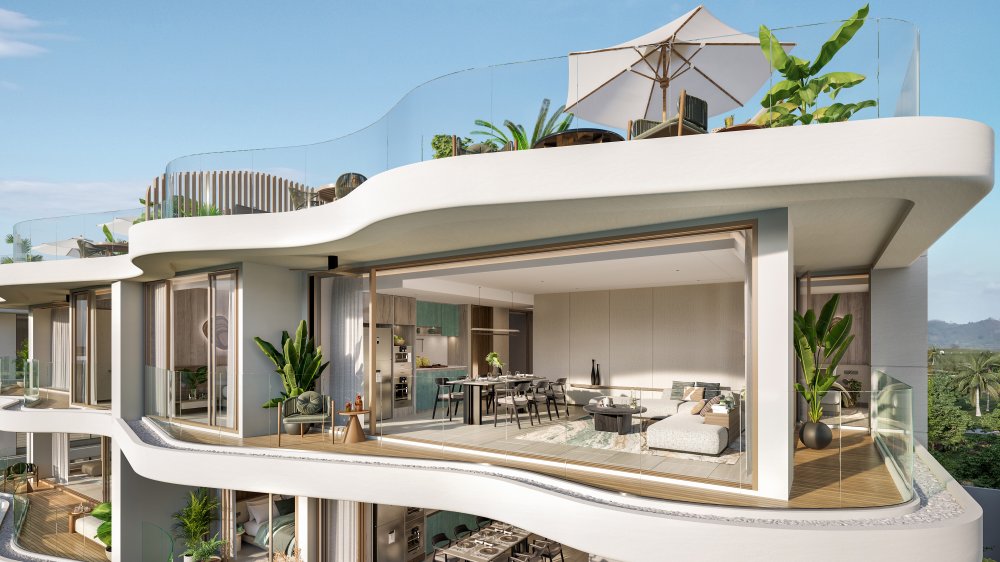 Каждая резиденция спроектирована с особым вниманием к гармонии с природой. Апартаменты с двумя спальнями и просторные пентхаусы с частными бассейнами на крыше выполнены в природном стиле: мягкие, землистые тона, органичные текстуры и обилие зелени создают уютную атмосферу, в которой легко расслабиться. Пространства внутри и снаружи плавно перетекают друг в друга благодаря широким проёмам, соединяющим зоны отдыха, столовую и спальни, а изогнутые террасы подчёркивают природные линии окружающего ландшафта.