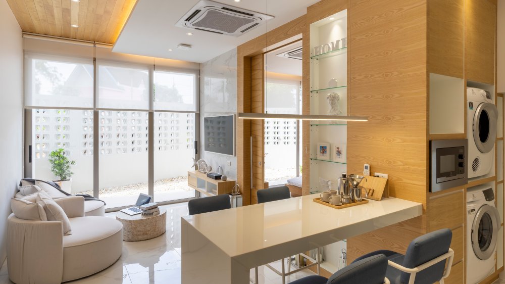 — Интерьеры вилл выполнены в стиле модерн. Стекло, натуральное дерево и светлые оттенки расширяют пространство, делают его наполненным светом и словно «дышащим» им. Умело подобранные аксессуары, премиальная техника, кондиционеры и медиасистема идут в комплекте.