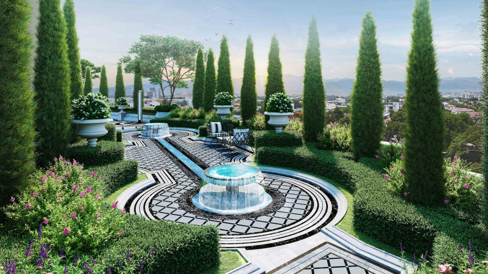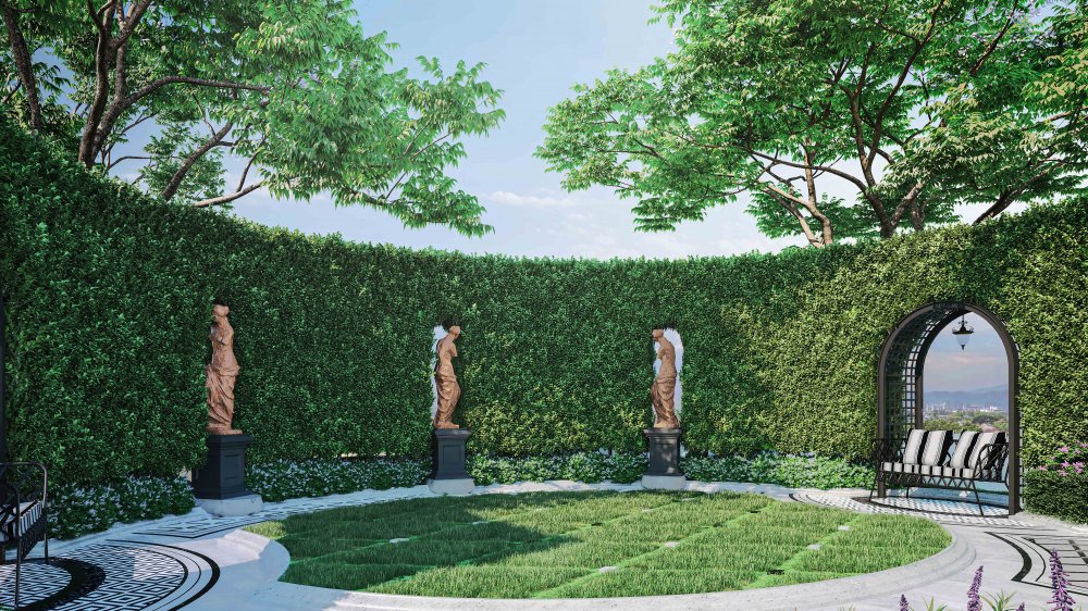 — Акцент на ландшафтный дизайн, который делает жилой комплекс поистине уникальным. Пышные зелёные сады выполнены в единой цветовой гамме с использованием оригинальных декоративных элементов — множества статуй, фонтанов, роялей-джакузи, беседок и многого другого. Этот целый цветочный мир, в котором каждый сантиметр тщательно продуман, поражает воображение и дарит совершенно новый опыт эстетического наслаждения.