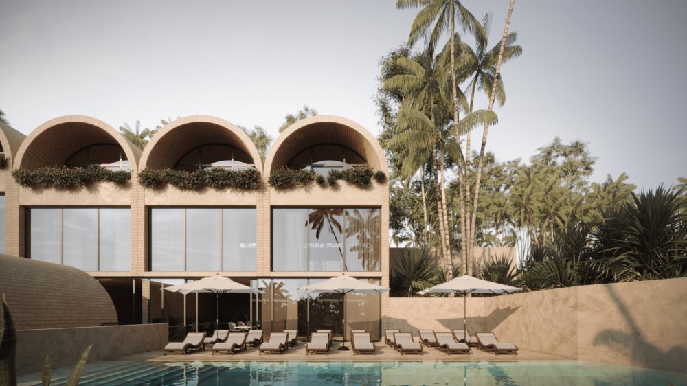 Уникальная архитектура проекта в палитре песочных оттенков с необычной крышей сферической формы и с элементами живых тропических растений.