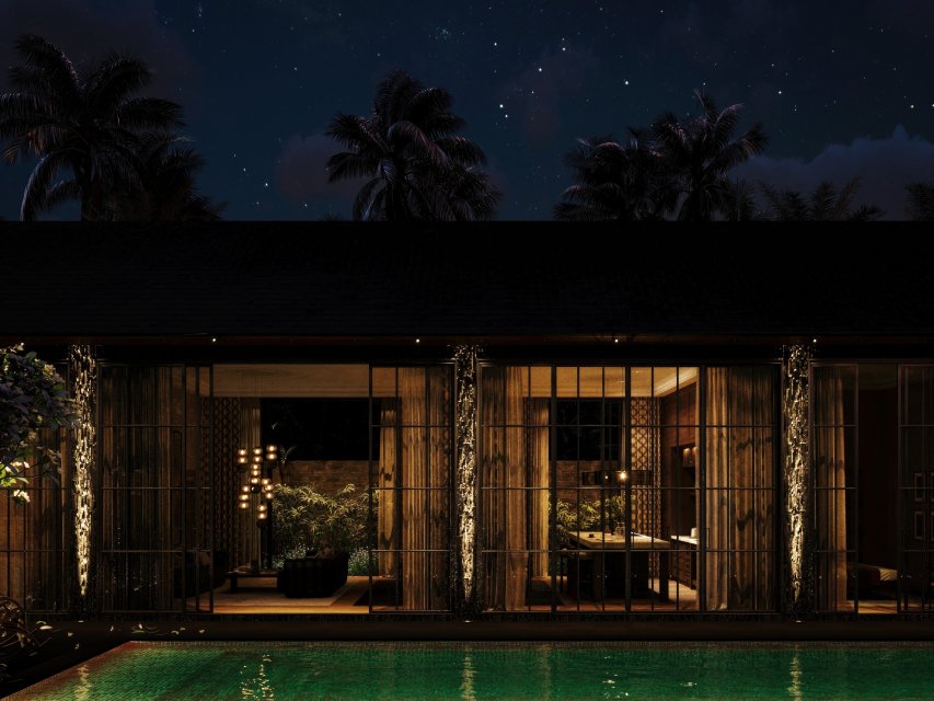 Фасад виллы отделан черным вулканическим камнем, бассейн — натуральным камнем Sukabumi.