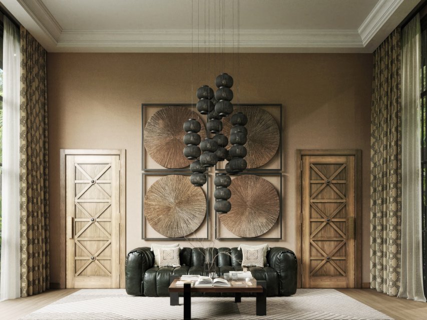 Уникальный интерьер с итальянскими диванами и индийскими паттернами на стенах.