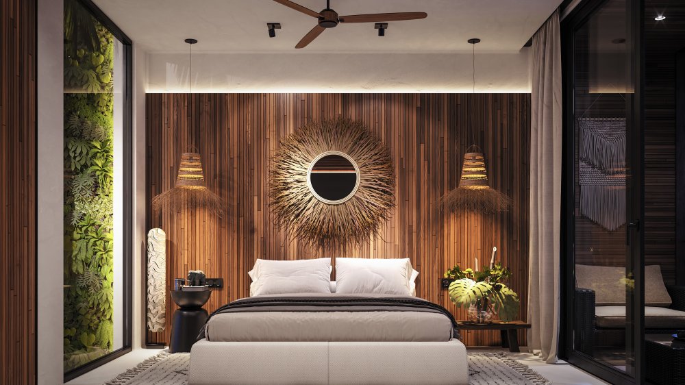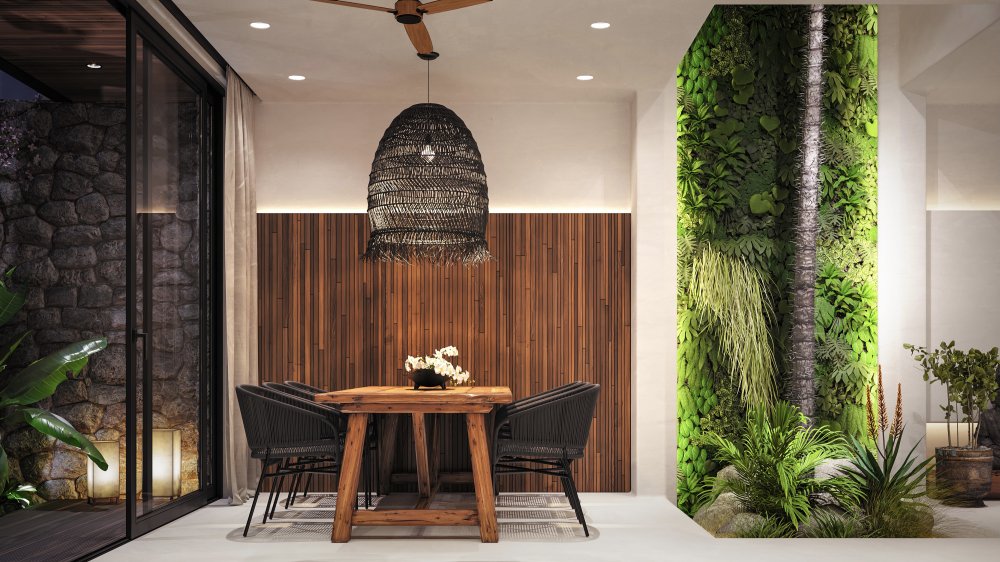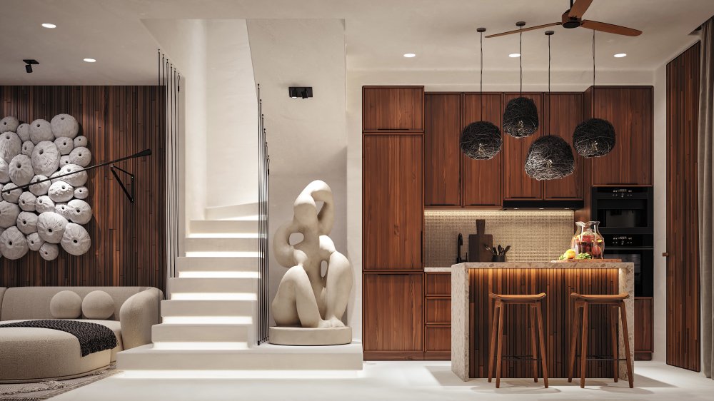 — стильный современный дизайн с элементами из камня и благородных пород дерева,