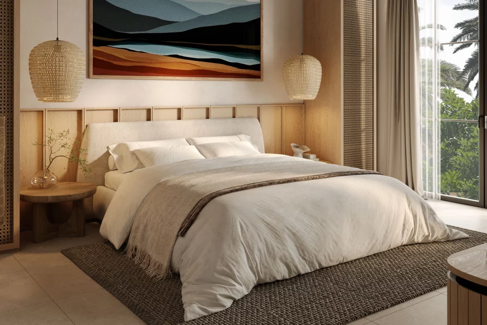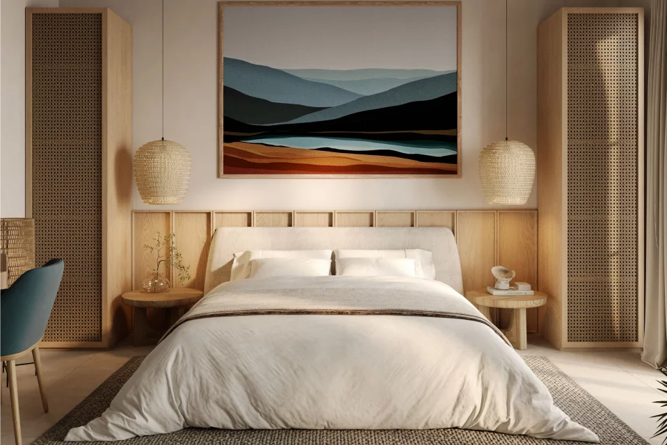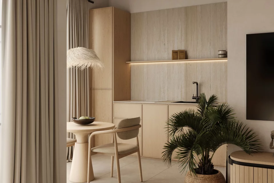 — Интерьеры оформлены в стиле джапанди со сдержанными акцентами цвета морской волны. Продуманные планировки, высокие потолки и просторные комнаты создают атмосферу уюта и комфорта.