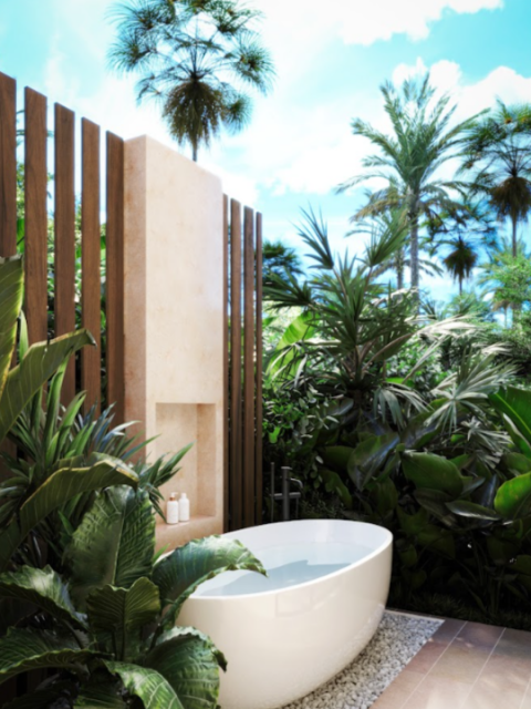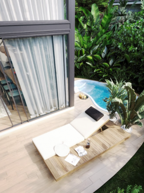 — Собственный бассейн с уютной террасой, окружённой тропическими деревьями.