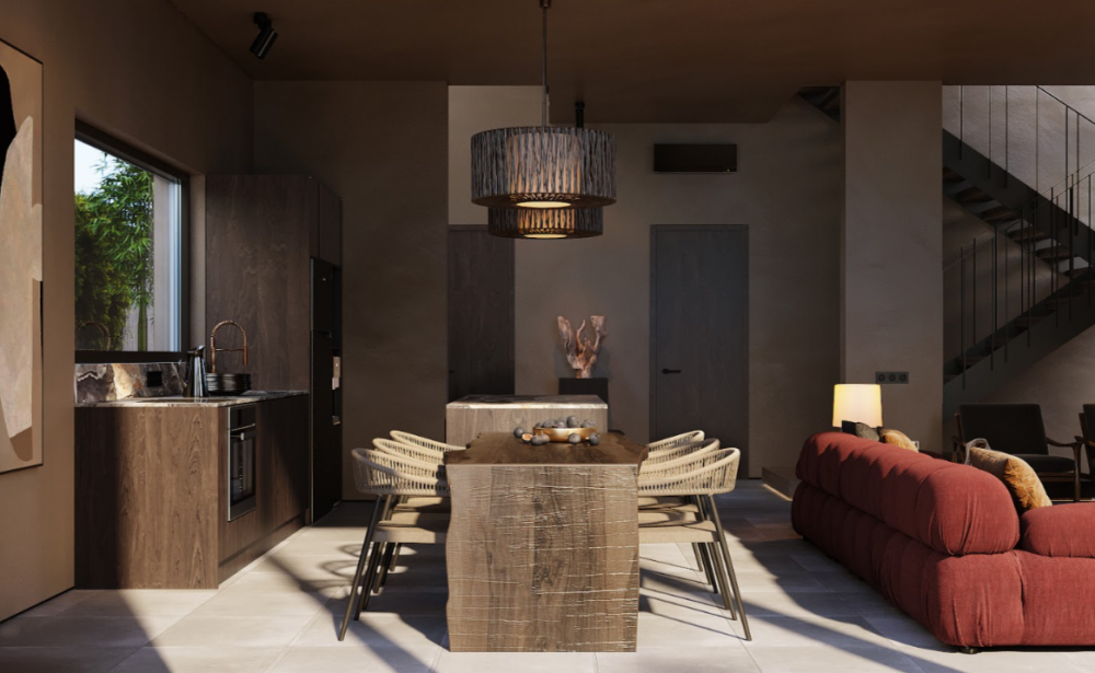 — открытая планировка объединяет кухню, столовую и гостиную, усиливая ощущение уюта и свободы,