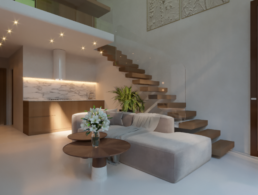 — высокие потолки, большие окна в пол и светлая отделка создают ощущение простора и наполненности светом;