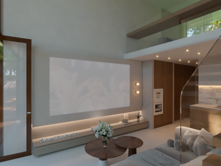 — продуманная планировка: гостиная с большим диваном и проектором, кухня в стиле минимализм, рабочее пространство, санузлы на каждом уровне;