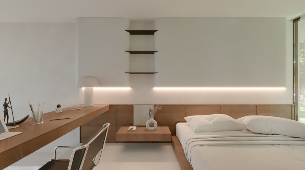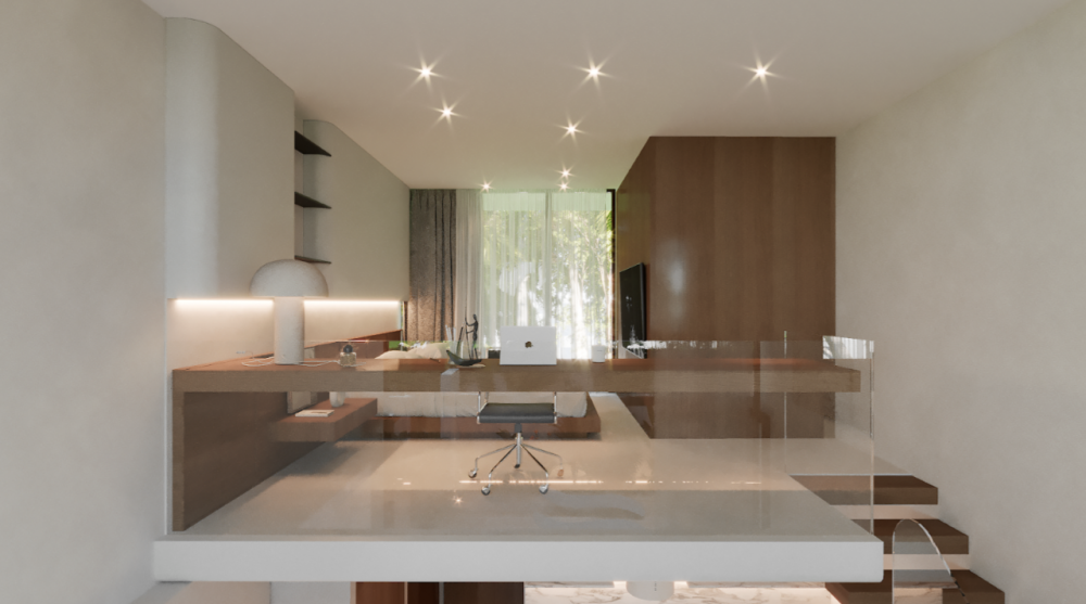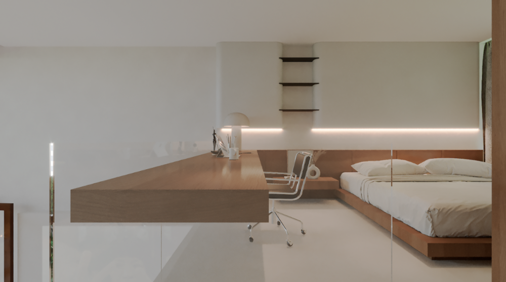 — спальня с кроватью king size размещена на втором этаже, к которому ведёт дизайнерская лестница;