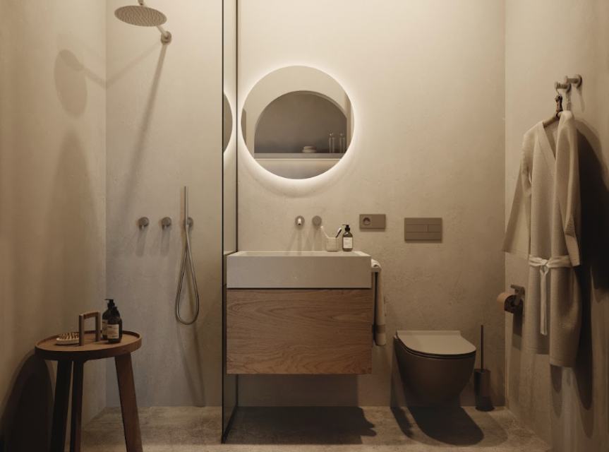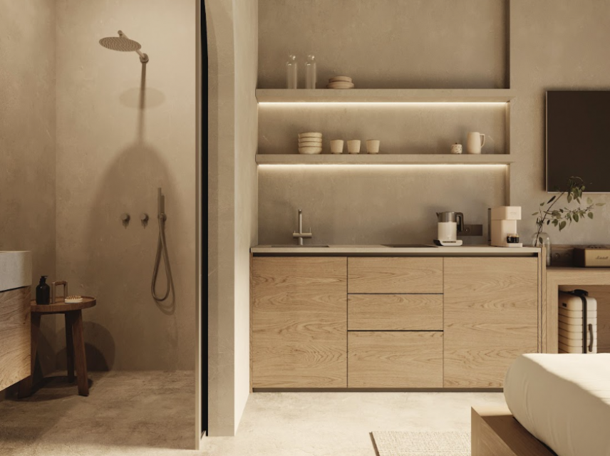 — Внутренняя отделка с использованием натурального камня, дерева и керамики.