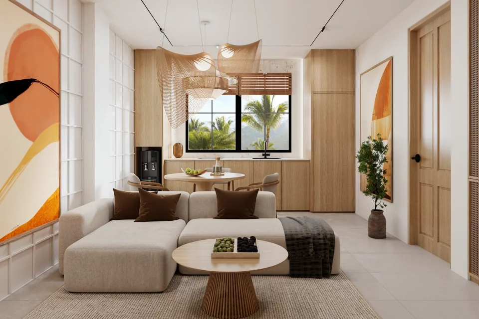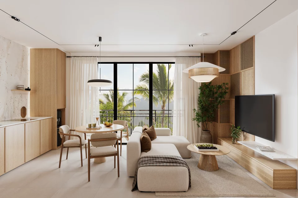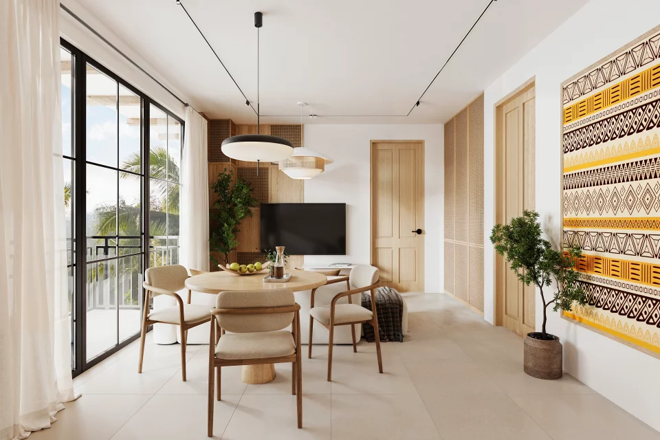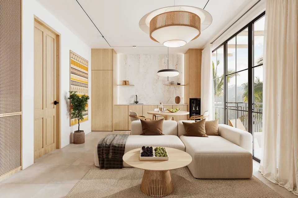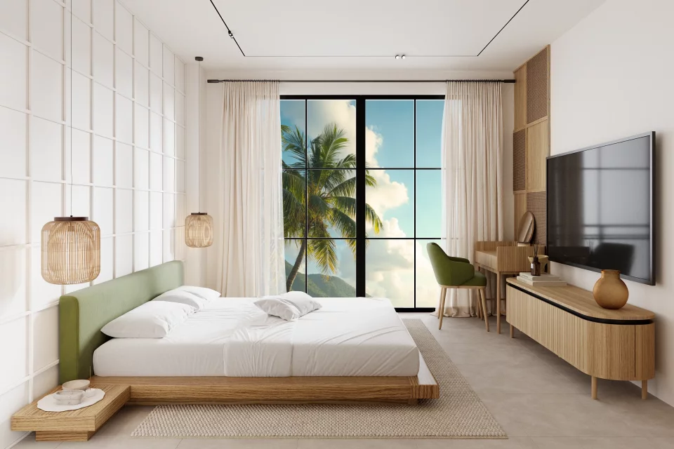 — Интерьеры выполнены в балийском стиле с использованием природных материалов, светлых тонов и мягкой текстуры дерева.
