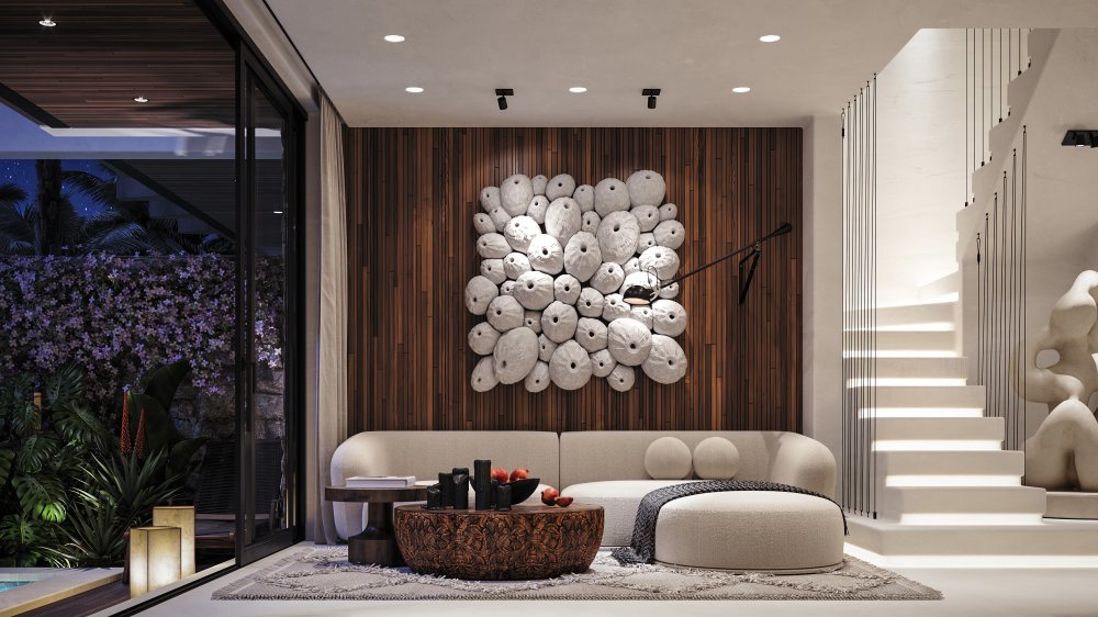 — стильный современный дизайн с элементами из камня и благородных пород дерева,
