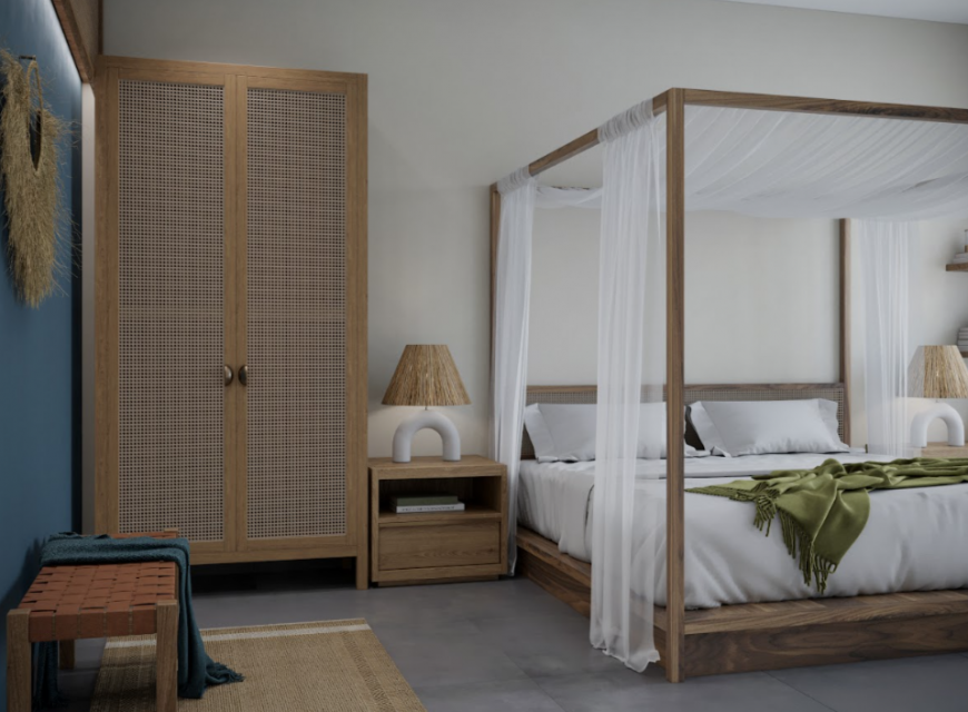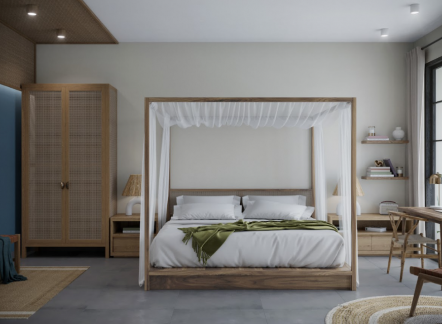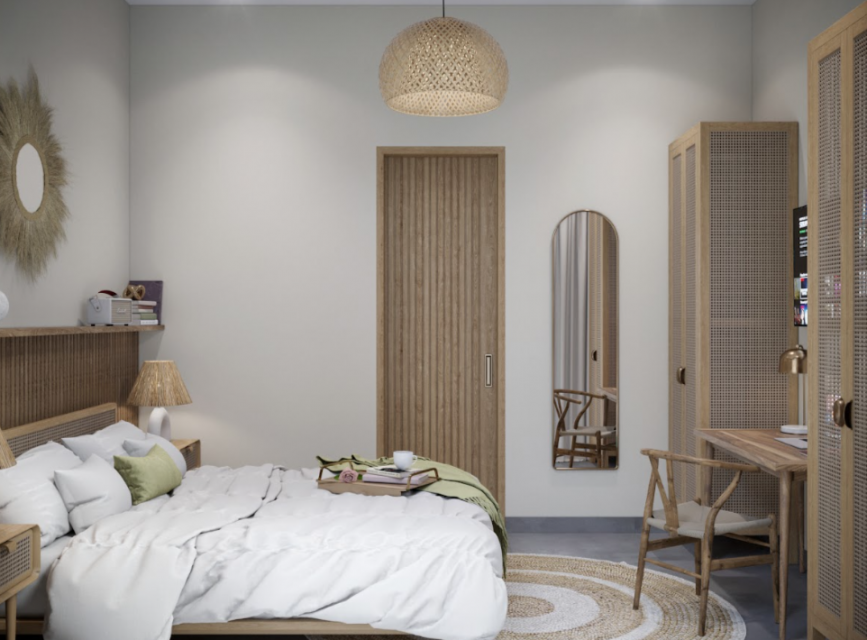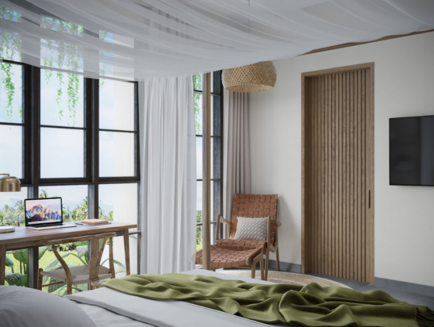 Предусмотрено два типа вилл: одноэтажные двухкомнатные и двухэтажные трёхкомнатные, с видами на рисовые поля.